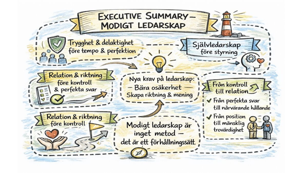Modigt ledarskap handlar därför om att kunna bära osäkerhet och samtidigt ge människor stabilitet. När ledare är transparenta, närvarande och tydliga skapas tillit – även i situationer där vägen framåt ännu inte är helt klar.